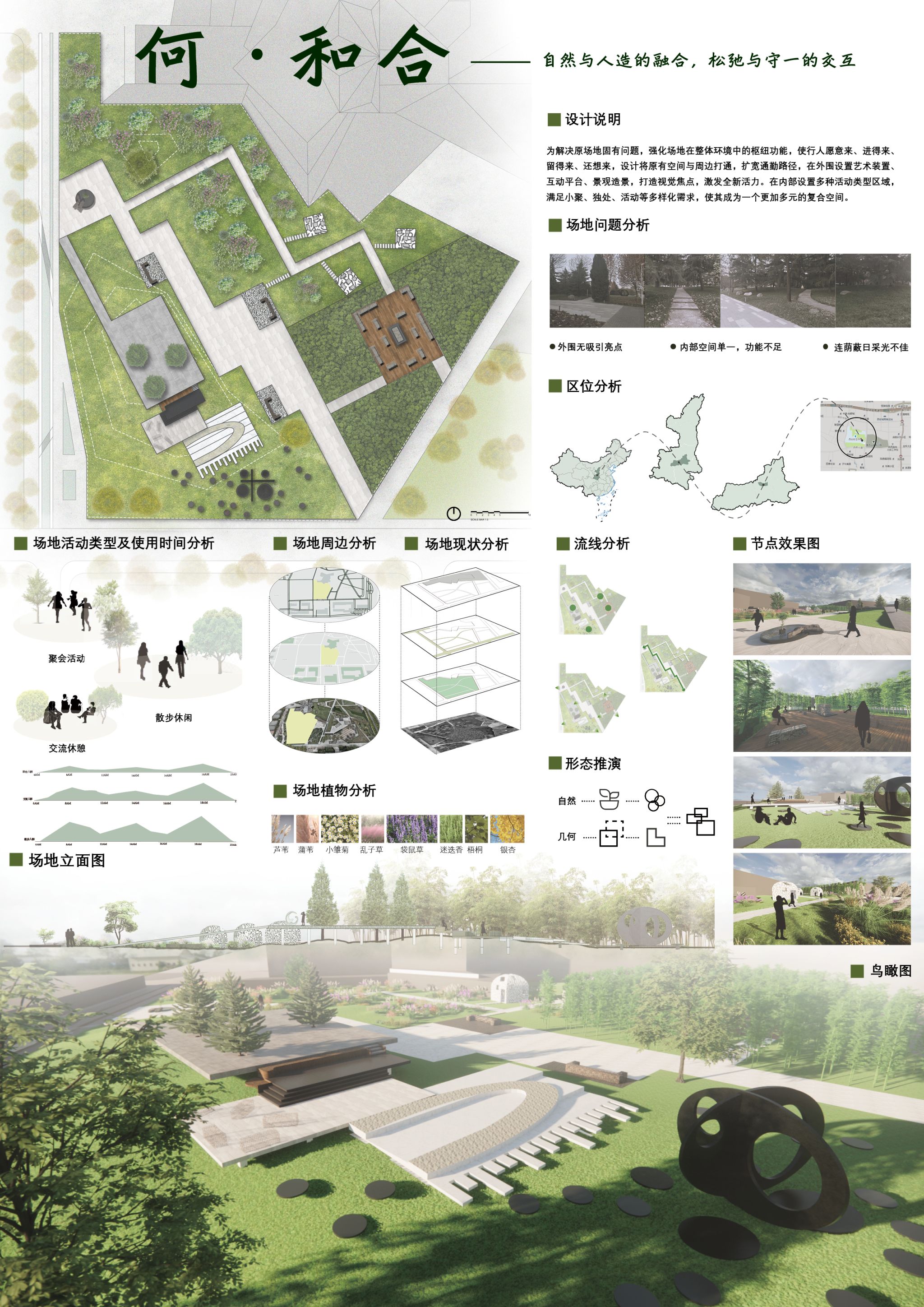 在“焕新校园”赛道,选手们着眼于校园空间的功能性和多样性。《何·和合》通过重塑金桥餐厅对面草坪,将其从一处固有问题频发的空地转变为校园核心枢纽空间。通过规划多种活动区域,满足聚会、独处及多样活动需求,使其成为一个多元复合的创新空间。