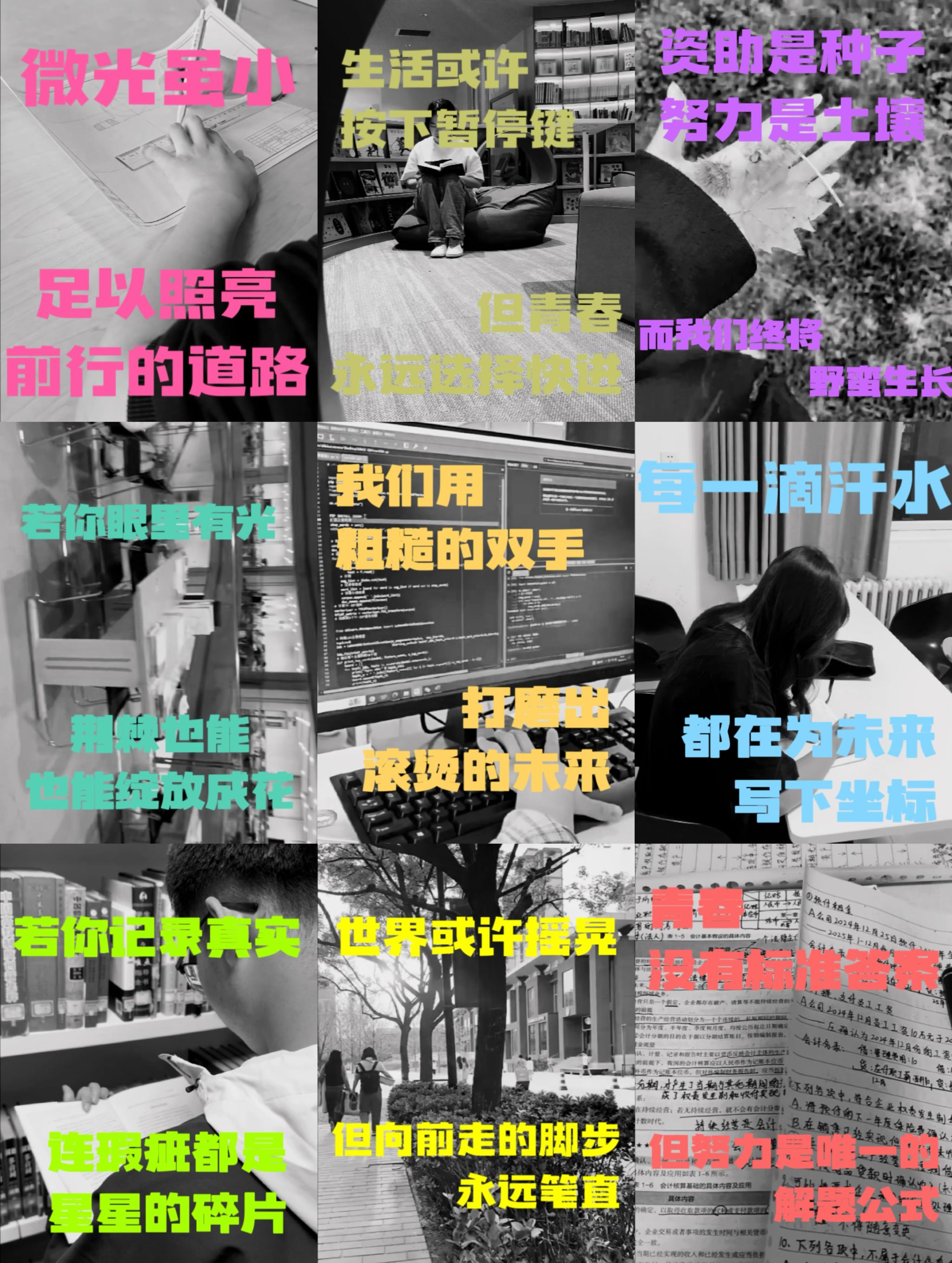在近一个月的作品征集中,123名同学积极参与,用镜头定格了无数动人瞬间:清晨图书馆的专注身影、勤工俭学岗位上的坚持、深夜攻克难题的执着……每一帧画面都凝聚着同学们对生活的热爱与对未来的期待。尽管作品在创意表达和内容深度上仍有提升空间,部分内容呈现同质化现象,但我们依然看到了大家用真诚与努力书写的青春答卷。