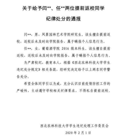 2月初,很多同学的朋友圈都被“西北农林科技大学两名大学生提前私自返校事件”所刷屏,为此,在学校的通报文件中,这两名同学也被给予了警告处分。很多网友表示,在学校两度明确通知延期开学的情况下,依然置通知于不顾,这既是对自己不负责,也是对他人不负责的表现。
