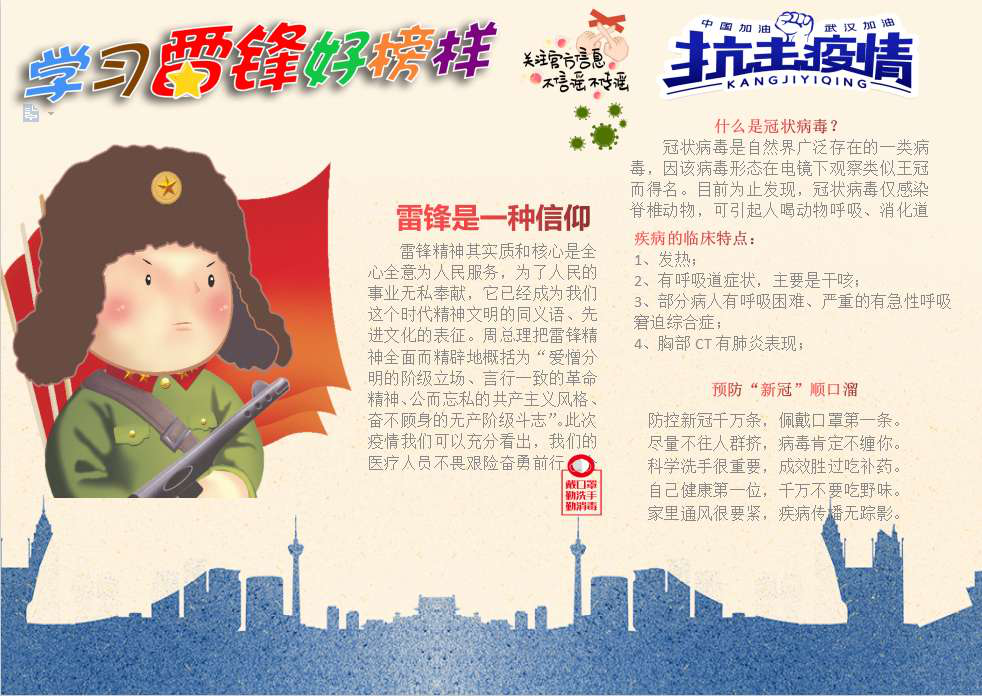 在全国众志成城抗击新冠肺炎疫情的关键时刻,为进一步学习和弘扬雷锋精神,引导学生党员及入党积极分子传承雷锋无私奉献、乐于助人的优良作风,坚定抗疫必胜信心,厚植爱党爱国情怀。第四青年社区分党委在广大学生党员和入党积极分子中积极开展了关于疫情防控和弘扬雷锋精神的手抄报活动。