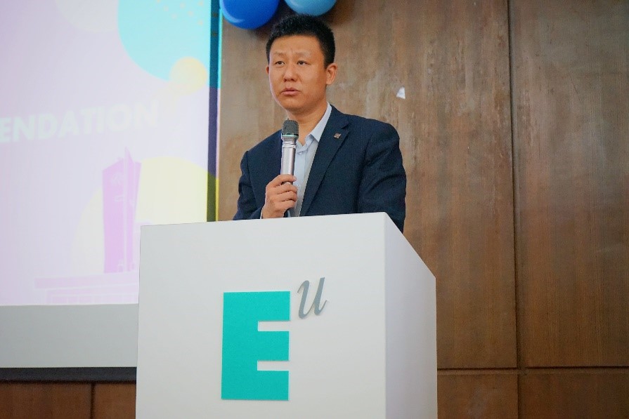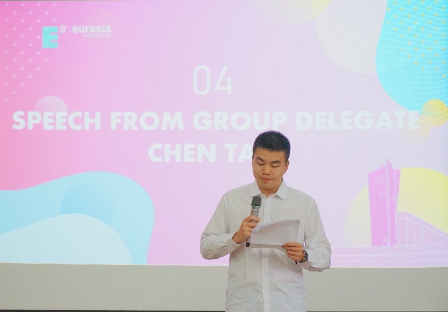 国际青年社区陈涛同学和黄振同学先后代表获奖的学生团队和获奖的学生个人上台发言。他说,作为获奖的学生团队,更应当戒骄戒躁,顺应时代潮流努力向前,踏实奋进,克服更多艰难险阻,继而创造出更多更好的青春成就。黄振同学在发言中也对老师、同学给予获奖学生的支持与帮助表示了感谢,并号召大家继续秉持欧亚学院“和而不同”的理念,努力在接下来的一年里做更好的自己。