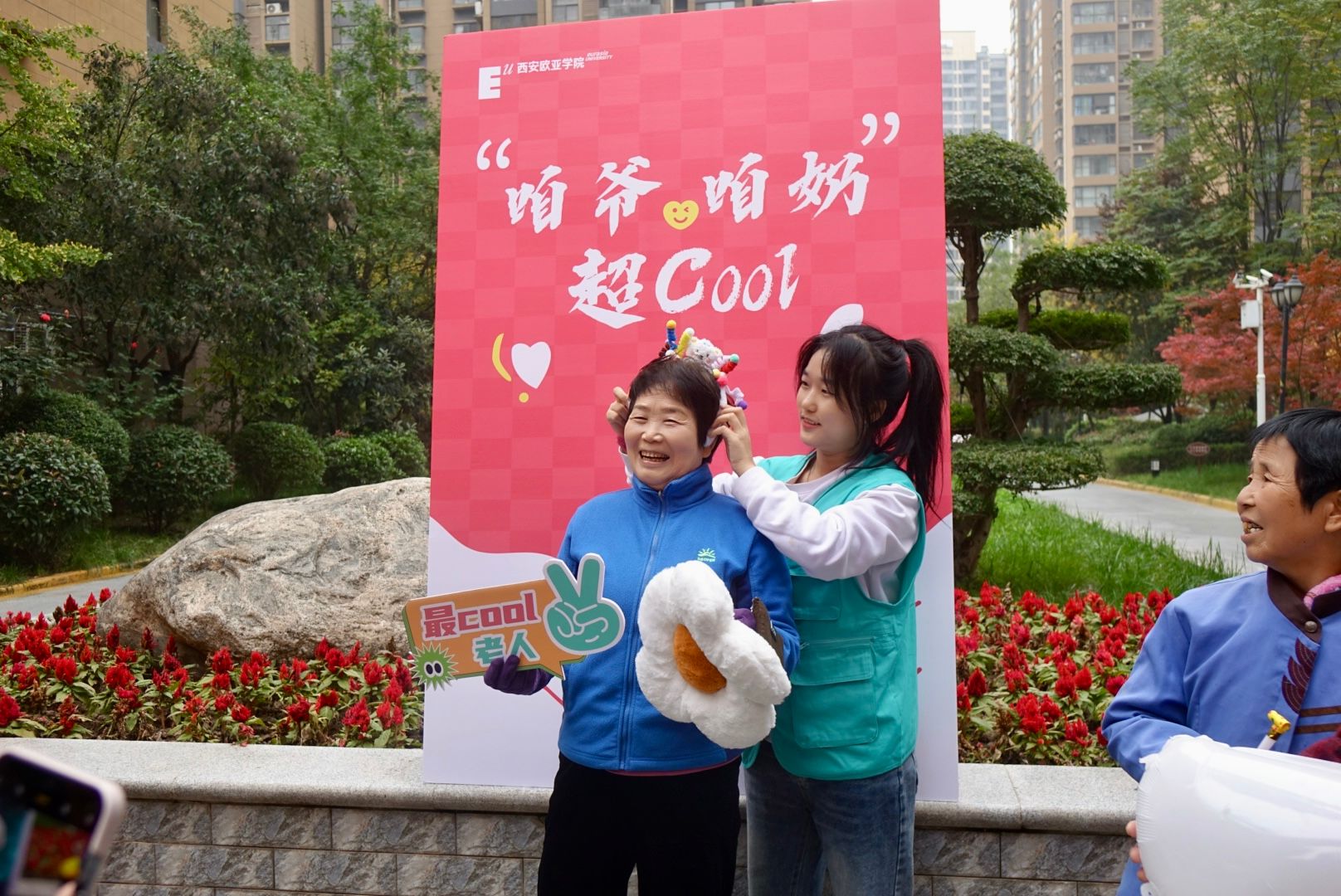 民乐合奏《彩云追月》的温柔旋律刚落下,潮拍环节直接炸场!志愿者们扛着相机就位,爷爷奶奶们瞬间开启 “抢镜模式”:扯扯衣角、理理发型,还主动拉着志愿者解锁潮流装扮,墨镜一戴、pose 一摆,每一张都是 “老年时尚大片” 既视感!