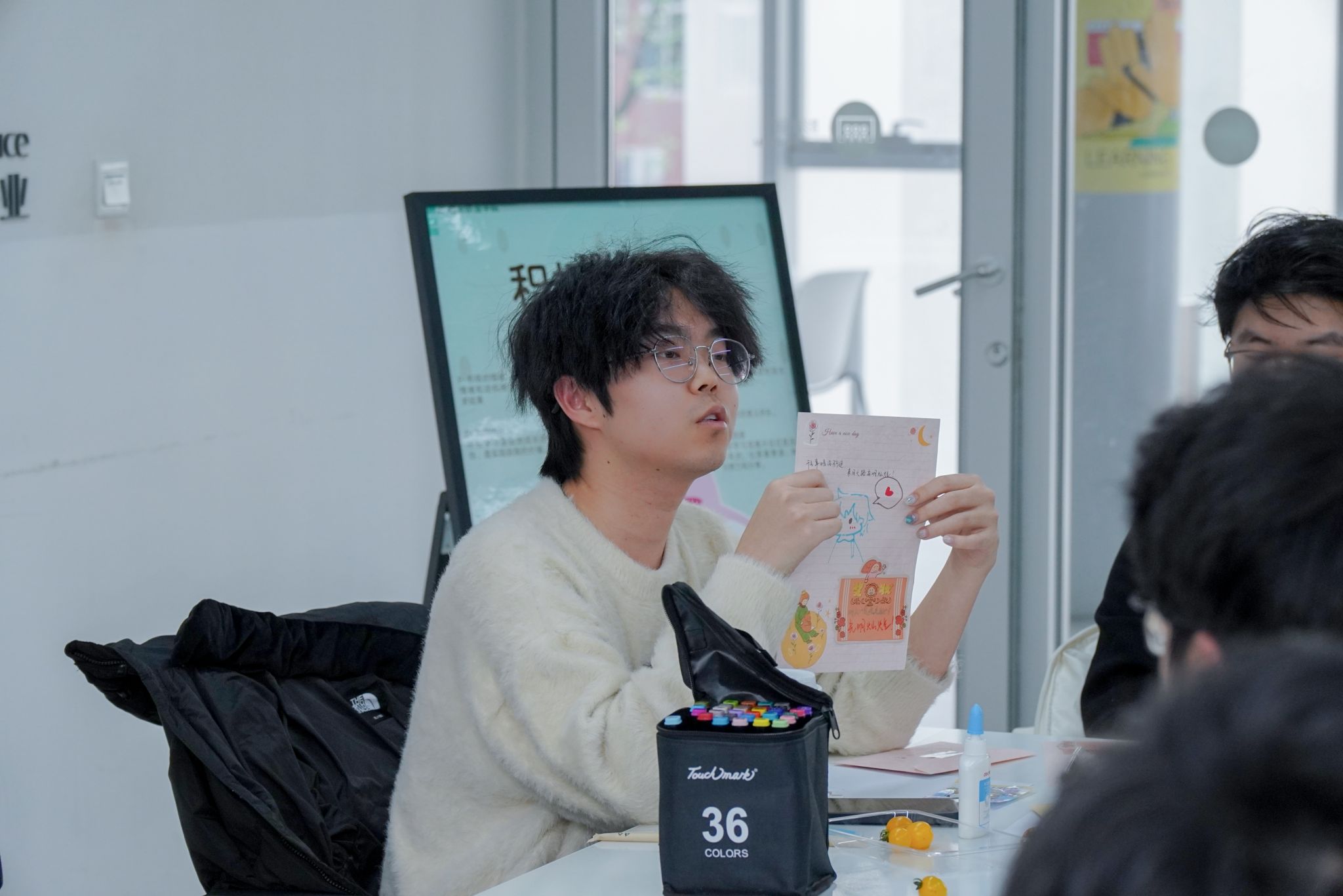 在活动的最后,大家用彩笔、贴纸在白纸上勾勒自我。在作品交流中环节中,同学们根据自己的作画介绍自身特质,这不仅契合培训中“助人助己”等职责认知高频词,也为同学们运用培训知识的积极意愿筑牢基础。