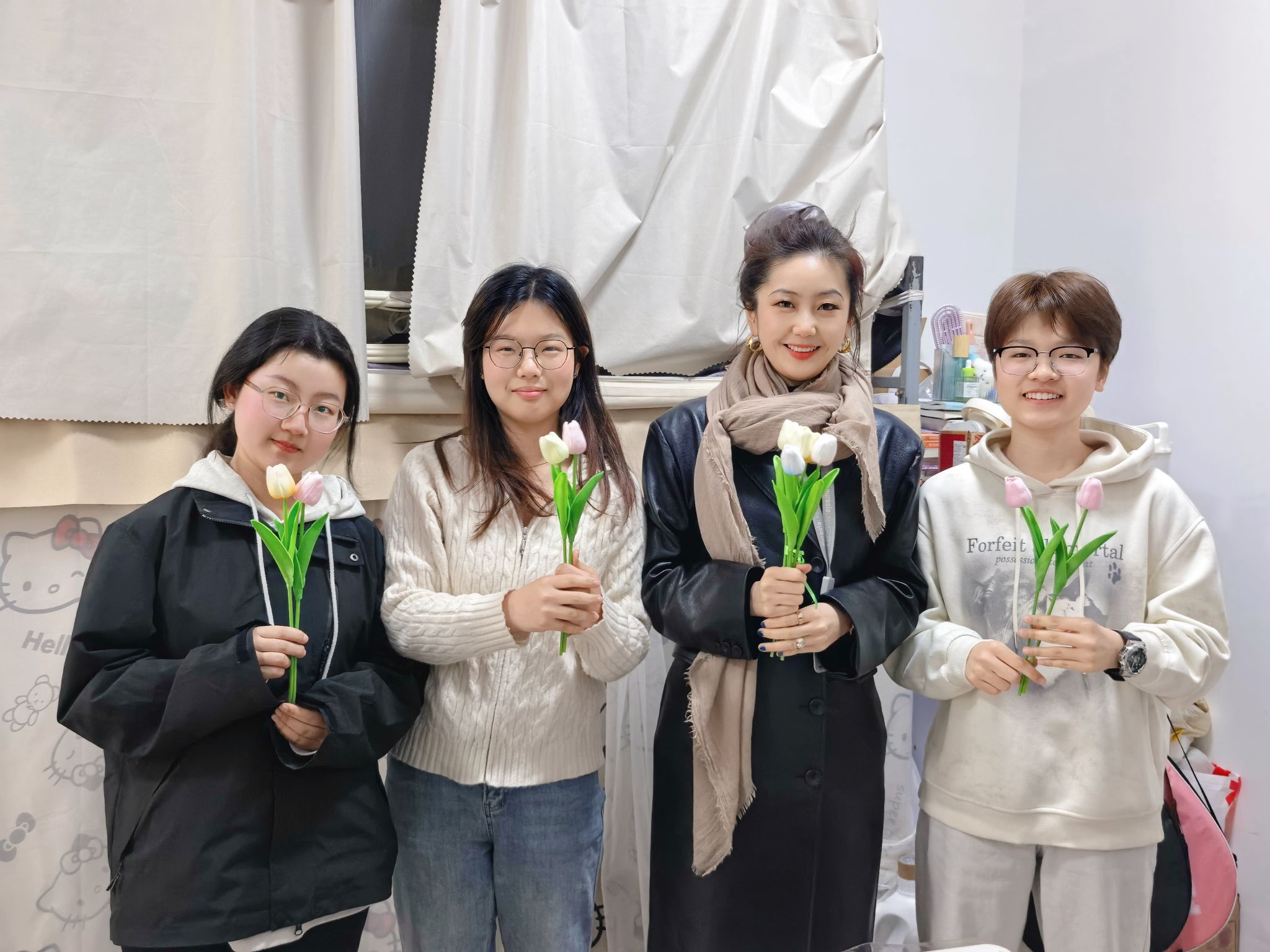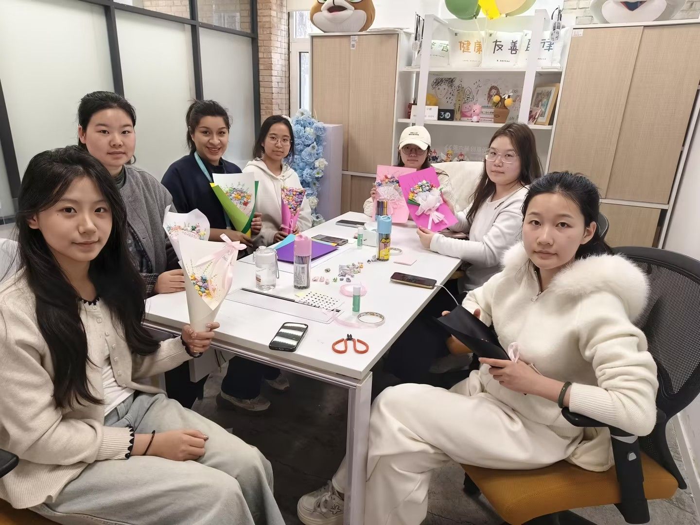 活动现场欢声笑语不断,师生角色在创作者身份中模糊,取而代之的是平等的"手作伙伴"。一位参与活动的老师表示:"今天和她们一起做创意花束,我发现她们身上有太多值得我学习的创意和活力,这种双向的同行特别有意义。"同学们也感慨:"和老师一起完成作品的过程,让我们看到了她们温柔细腻的一面,拉近了我们的距离。"