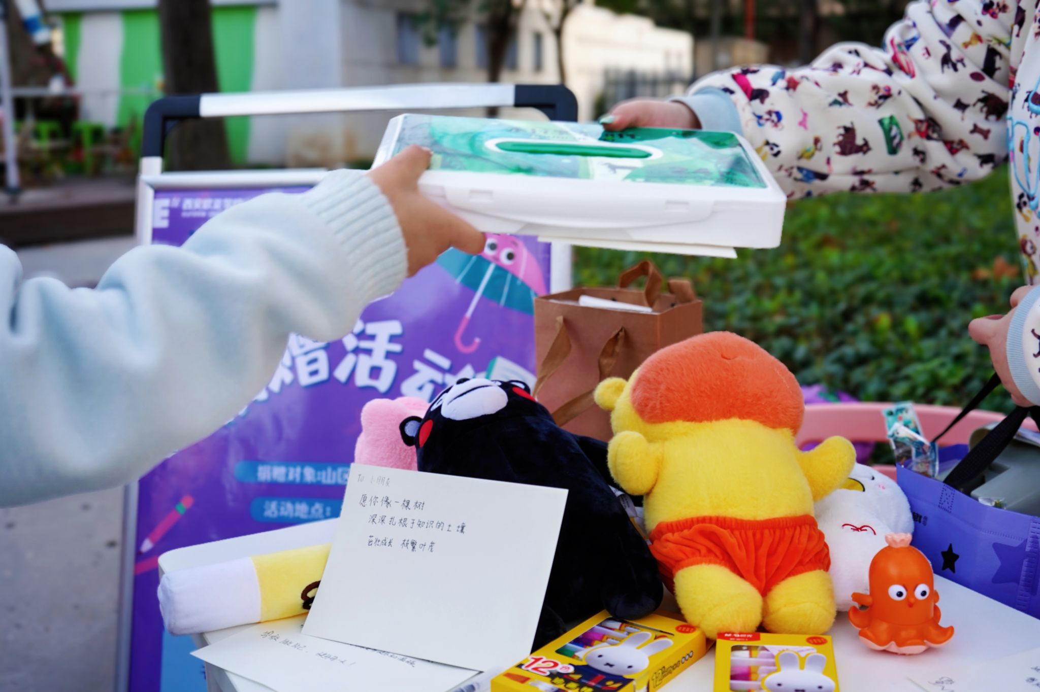 活动前期,青年社区通过企业微信群、宿舍走访等方式广泛宣传,号召学生们捐赠闲置干净的衣物、学习用品、书籍。活动现场,友TA志愿服务队的志愿者们早早准备好储物箱在宿舍楼门口等候,学生们热情参与,有人带来崭新的画板画笔画纸套装,说“想让他们画出春天的颜色”;有人送来洗得松软的毛衣,特意标注“这是我去年的新年衣服,很暖和”;还有人带来了毛绒玩偶,希望能给孩子们带来快乐。