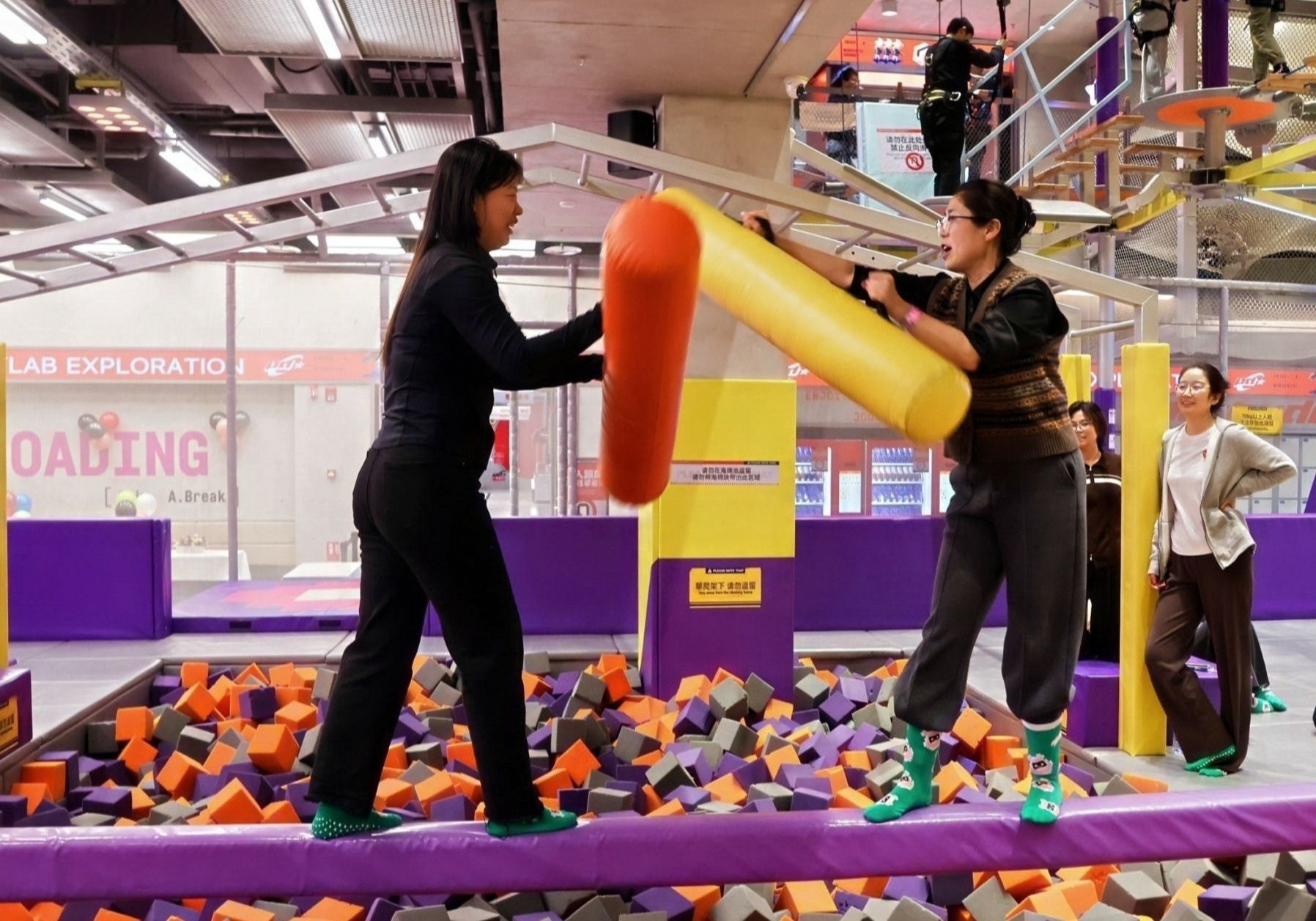 有人一上来就发起猛攻,有人选择稳扎稳打,有人被晃下去三次又爬起来三次。场边的呐喊声一浪高过一浪,每一场对决的胜负都会引发欢呼或叹息。但比输赢更有趣的,是那些意外瞬间:两个人同时失去平衡,双双跌落,却在地上笑作一团;有人掉下去之后第一反应不是懊恼,而是伸手扶住还在摇晃的对手。