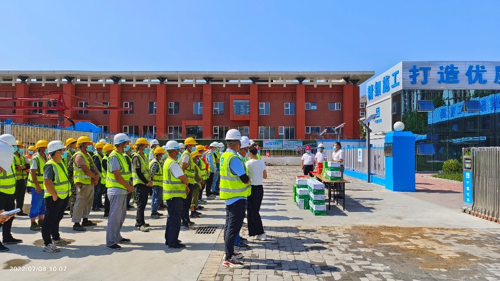 校领导来到西区学生服务中心及北区1号公寓楼施工现场,对在场施工的人员表达了学校的殷切关怀,并嘱托大家一定要注意防暑、多喝水,出现身体不适等情况要第一时间报告管理人员,尽快进行处理。