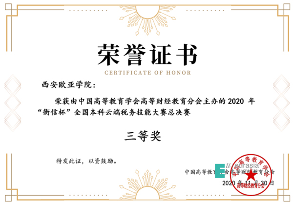 11月28日,由中国高等教育学会高等财经教育分会主办的2020年“衡信杯”全国本科云端税务技能大赛总决赛在线上成功举办。本次大赛历时2个多月,共有近220所高校、近1800余名参赛选手经过海选赛、预选赛的激烈选拔,最终全国143所院校、572名选手进入决赛。其中不乏来自武汉科技大学、华东交通大学、西南财经大学等知名高校的优秀选手。此次比赛由会计学院崔芳、黄婷老师带队,带领着经过层层选拔的四名优秀选手王瀚乐、罗延洁、朱叶、杨柳参加。竞赛过程中,学生扎实的专业基础使其在紧张激烈的竞赛氛围中保持沉着镇定,赛出水平,赛出风采,最终斩获全国三等奖,崔芳、黄婷老师获得优秀指导教师奖。