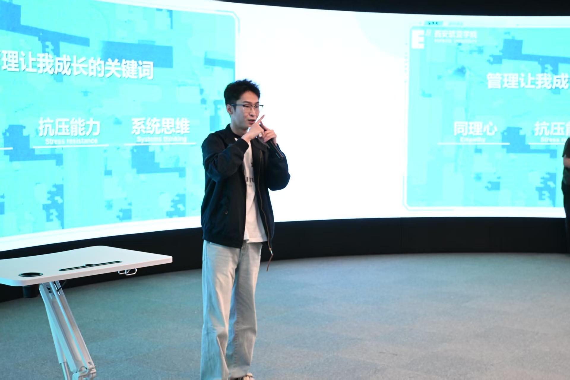 “管理不是控制,而是成就别人”从学生工作的真实体验出发,李明轩分享了从困惑到成长的转变历程,提出管理的本质是成就他人,关键在于真诚沟通与彼此看见。他提炼出系统思维、抗压能力、同理心三大成长要点,鼓励大家以担当面对挑战、以真诚联结同伴,在服务与协作中突破自我,抓住每一次成长契机,不断变得成熟与坚定。