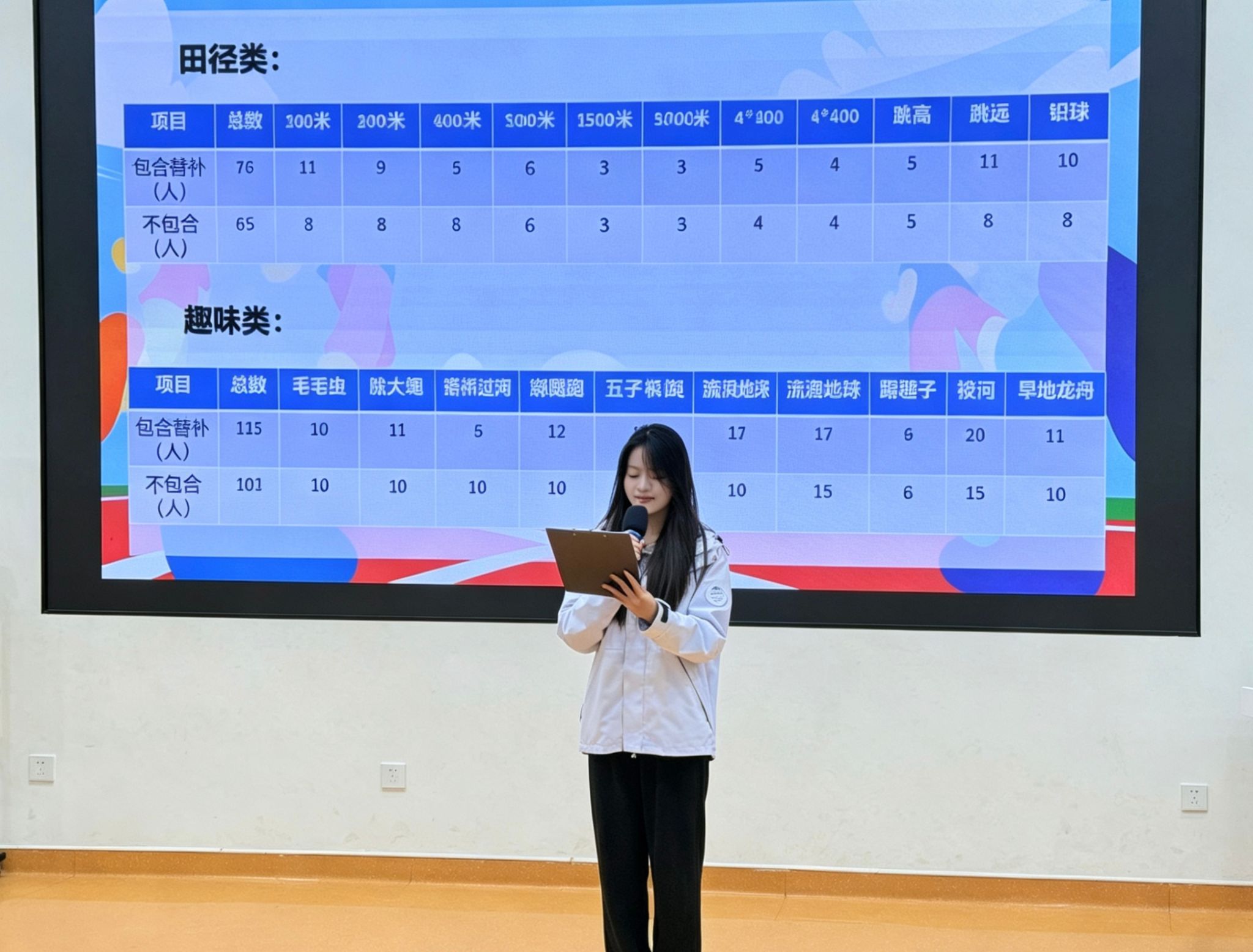 大会第三项,进行运动会项目介绍。本次运动会的项目分为田径类与趣味类两大板块,田径类包含短跑、中长跑、接力赛、跳高、跳远等项目;趣味类包含毛毛虫、跳大绳、搭桥过河、绑腿跑等形式,赛事丰富,项目多样。