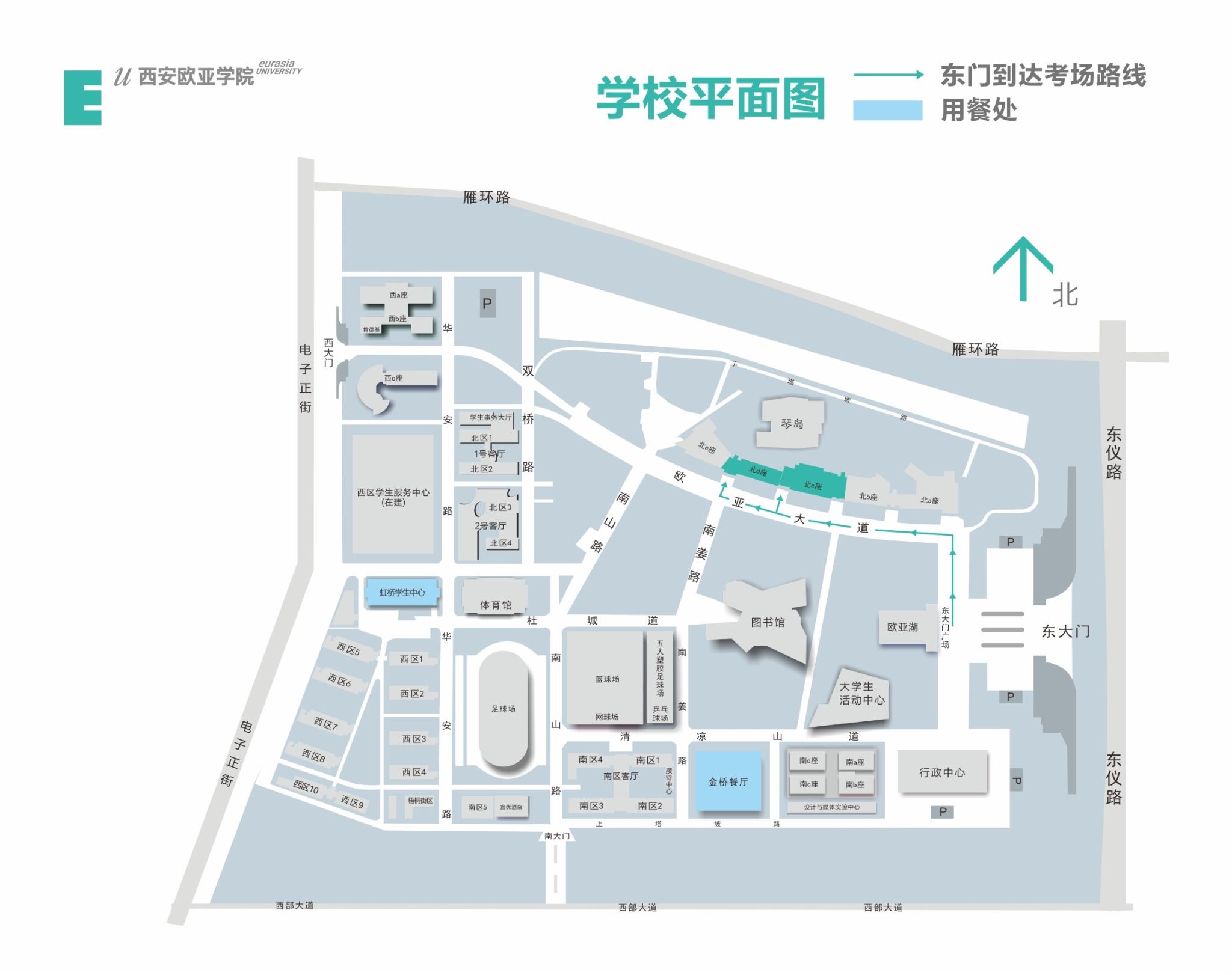sunbet申慱官网考点位于陕西省西安市雁塔区东仪路8号,请各位考生从申慱官网东门进入,考场位于教学北区C、D座教学楼。因进入考试封闭区和考场时需要接受智能安检、存放物品以及身份验证,请考生至少提前1小时到达考点,留足入场检查时间,以免影响考试。考试楼宇位置及进校路线见下图