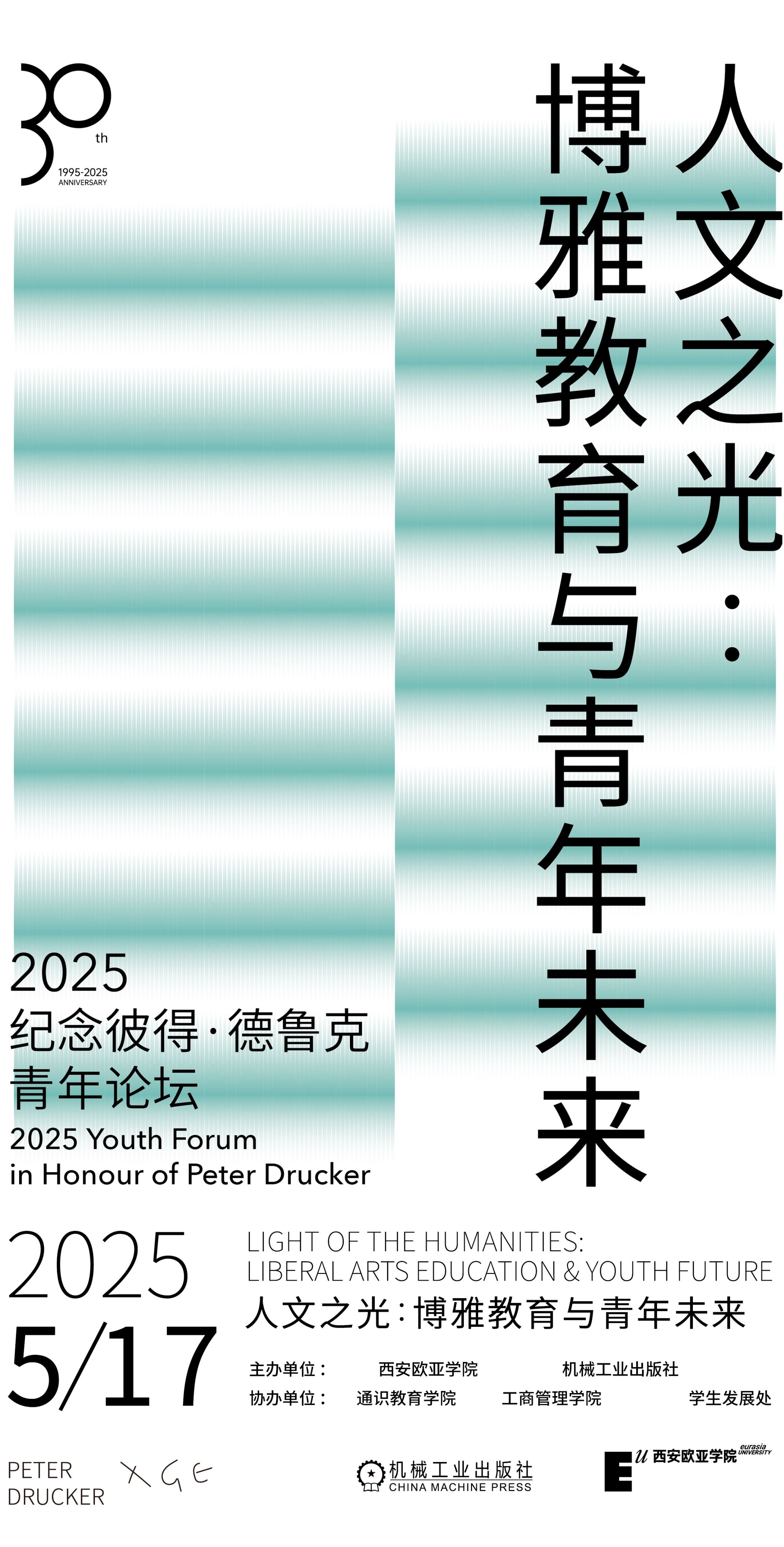 5月17日,“人文之光:博雅教育与青年未来”2025纪念彼得·德鲁克青年论坛将聚焦德鲁克思想与青年成长的深度融合话题,邀请学界权威、企业领袖及青年代表,通过主题演讲、青年TED分享、互动对话等形式,探索德鲁克思想在领导力培养、创新实践中的核心价值,助力青年构建“德鲁克心智”,成为未来管理领域的引领者。