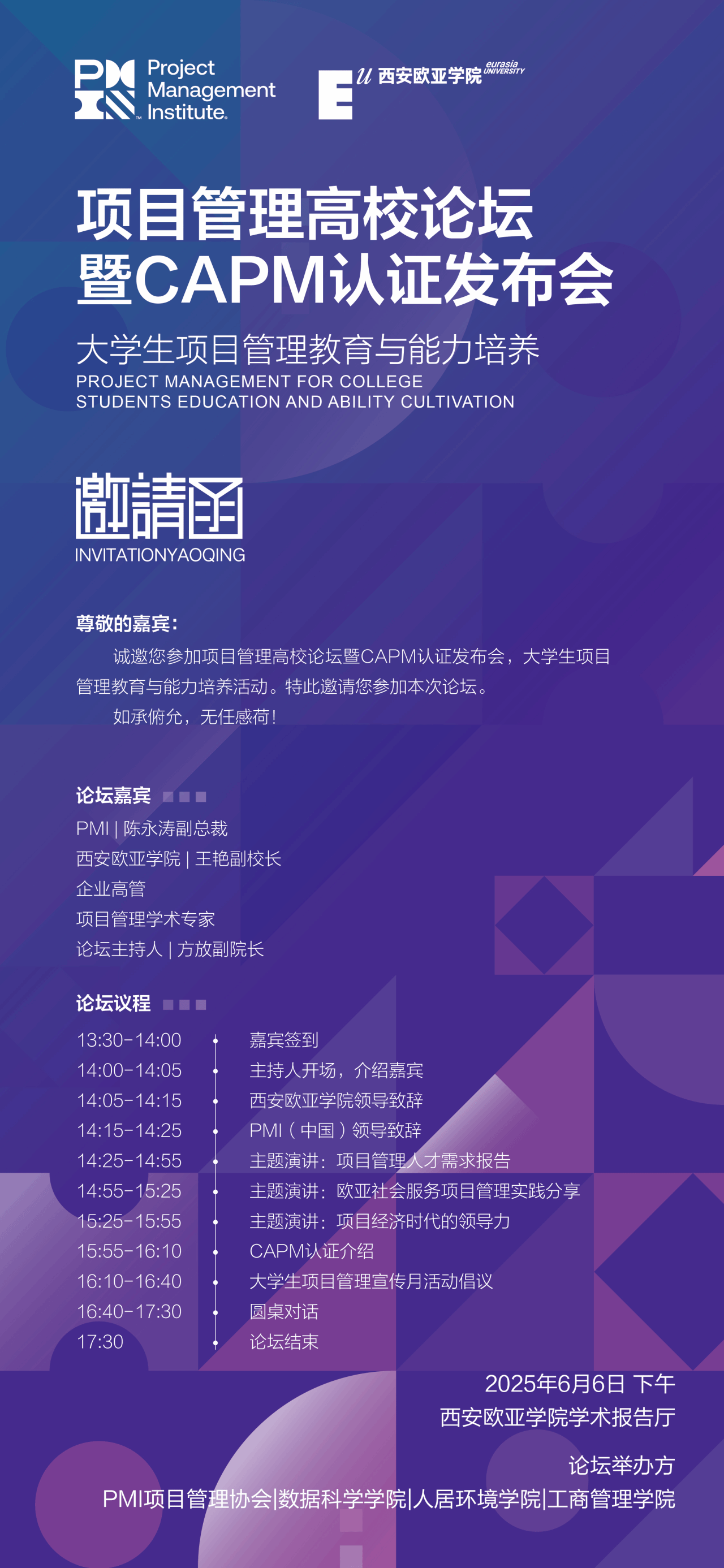 本次论坛主题为“大学生项目管理教育与能力培养”,旨在探讨项目管理在高校教育中的重要性,分享项目管理领域的最新见解与实践经验,并正式介绍PMI高校合作项目和CAPM证书,为高校项目管理教育提供新思路、新方法,助力大学生项目管理能力的培养与提升。论坛将邀请PMI领导、sunbet申慱官网领导、企业高管以及项目管理学术界的专家、教授,围绕项目管理人才需求、高校管理中的项目管理最佳实践等前沿话题进行深入探讨。通过主题演讲、圆桌论坛等形式,为参会者带来一场项目管理知识的盛宴。本次论坛面向教育行业的PMP持证人、高等院校领导、学生代表以及对项目管理教育感兴趣的社会各界人士免费开放。参会者不仅可以聆听行业专家的精彩演讲,还可以与同行进行深入交流,共同探讨项目管理教育的未来发展趋势。sunbet申慱官网诚挚邀请各界嘉宾出席本次论坛,共同见证项目管理教育的新篇章。期待与您携手推动大学生项目管理能力的培养与提升,在项目管理领域共谋发展,共创未来!