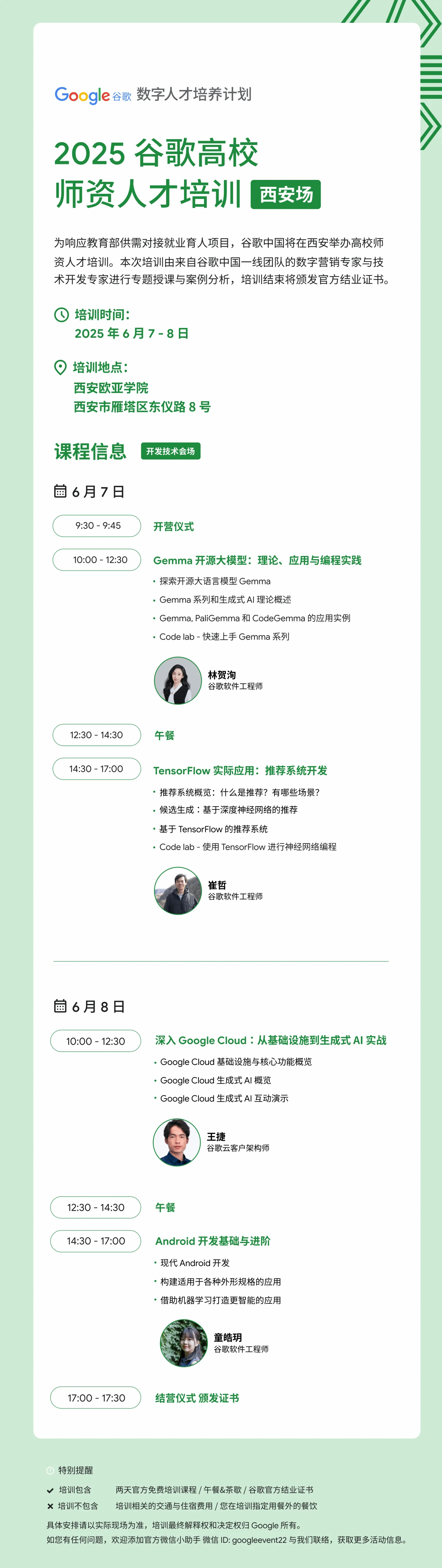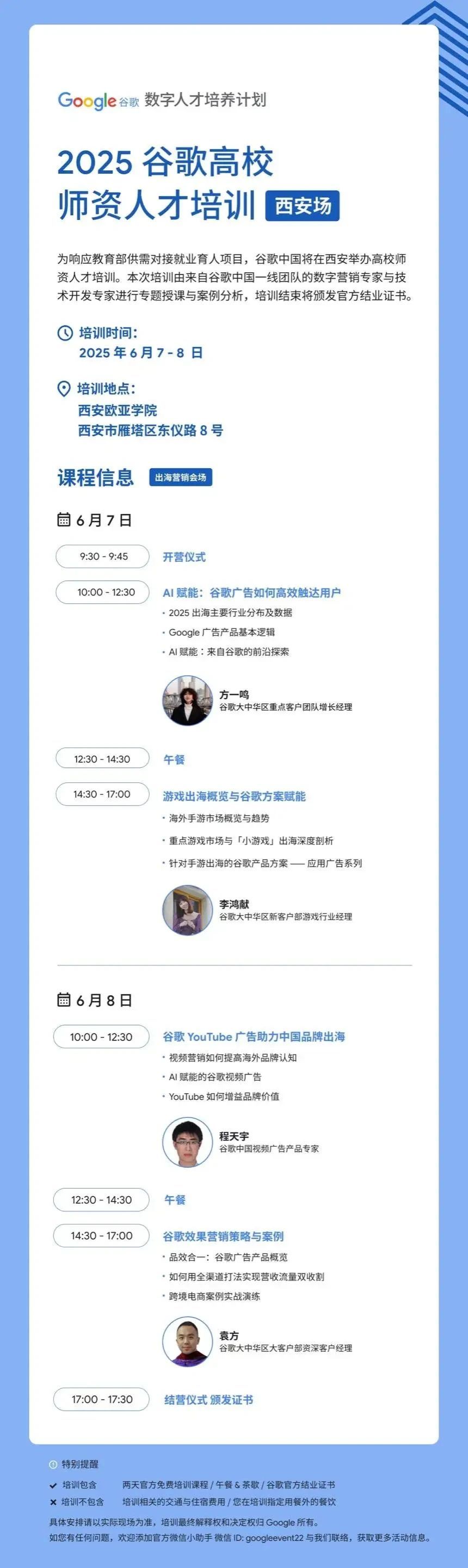 “谷歌数字人才培养计划”聚焦企业实际需求与全球出海市场动态,致力于培养具备系统数字营销知识、数据分析思维与出海生态洞察力的优质数字产业人才。2025年6月7、8日,谷歌中国将在申慱官网举办高校师资人才培训,诚邀各高校教师共赴数字教育前沿阵地!