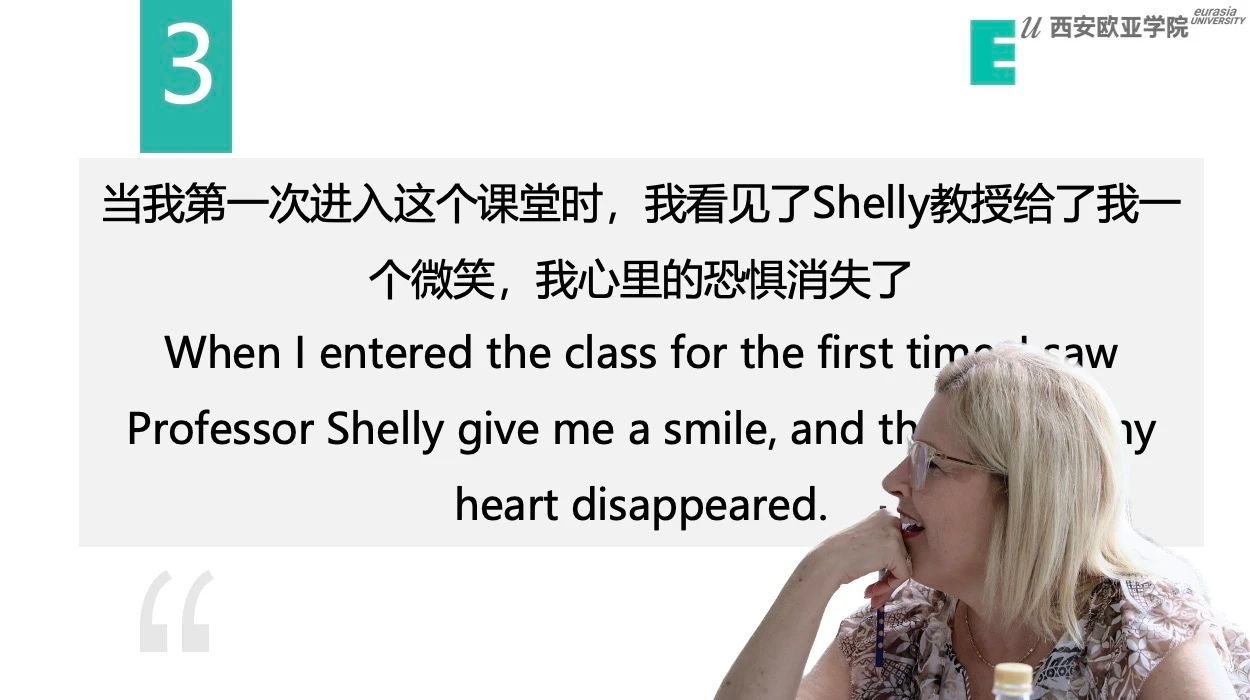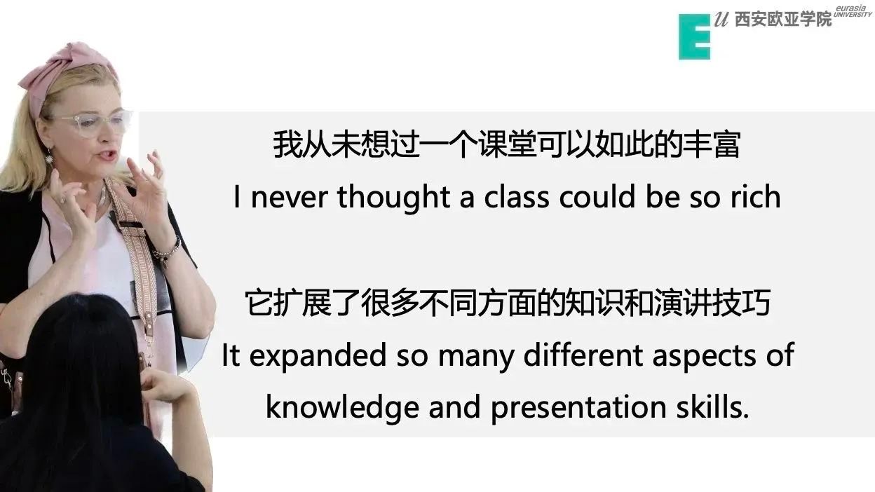 “... 我最喜欢的是外教Prof. Liu关于美国和中国有什么差异的介绍,这个系列一共上了四堂课,介绍了中国与美国文化习俗有什么不同,中国与美国的语言有什么不同,中国与美国学分算法有什么不同。这不仅使我拓宽了国际视野,了解到各地方文化差异,加深了对于两地区的认知,也让我对于语言有更深层次的理解,大幅提高了我的英语演讲与交流能力,清楚了自己性格的优缺点。我非常希望这个活动以后能继续开展下去,与来自不同文化背景的人一起,真正地进行交流互动,做一个和而不同、具有国际化视野的欧亚人。”