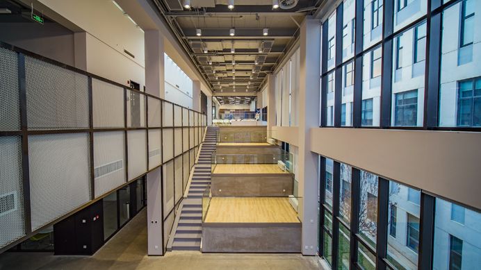 设计与媒体实验中心室内空间布置的功能主要包括工作室和展示使用。其工作室有艾德艺术设计学院的建模工作室、数字输出中心、跨领域联合办公室、新材料及创新设计教育中心、沉浸式交互实验室、数字影像工作室;文化传媒学院的互动与文化创意中心、网络新媒体中心、无人机影像工作室、创意传播工作室。展示空间分别有两个小厅以及一个以大台阶为主体的复合型演示空间。作为欧亚全新的资源整合中心,设计与媒体实验中心以开放性空间和校企合作的包容性态度,...