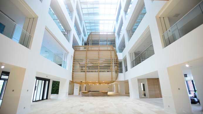 位于楼体中心的特殊装置“鸟巢”,是作为互通空间里的会议区域,全透明的玻璃架构外层同等距地包裹着木条,既不影响光线的穿透感,又保留了一丝视线的隐秘感。考虑到光的因素,行政中心楼层的颜色透明度各异,由下自上逐层加大。渐变色的回廊墙体,围绕并包裹着位于不同楼层、不同位置的3个鸟巢,好似太空中的球体,让置身其中的人仿若漂浮一般,慢慢遗忘外界而进入一个新的境界。