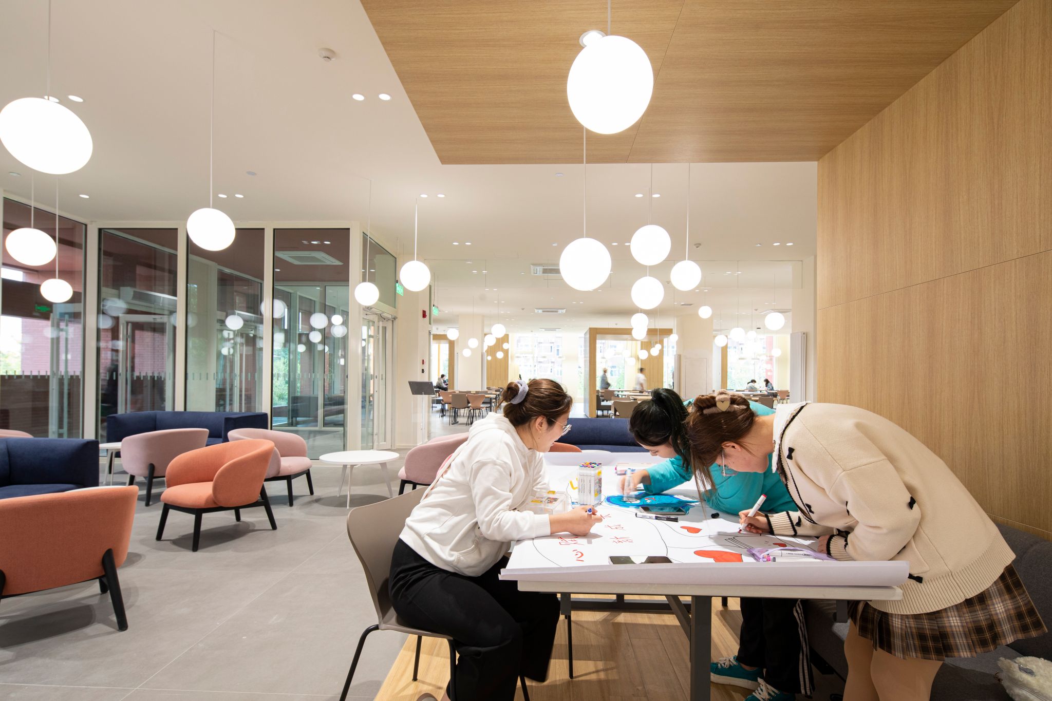 南区学生客厅,于2020年投入使用,在原有的公寓楼四合院里,将4栋楼用大面积的玻璃及钢结构材料连接起来,形成了一个70多米长的通廊,随光影变化而若隐若现。通廊集合了交通、导向、游憩等功能,高效地将公共空间整合在一起,高效覆盖南区、西区学生的学习、生活需求。