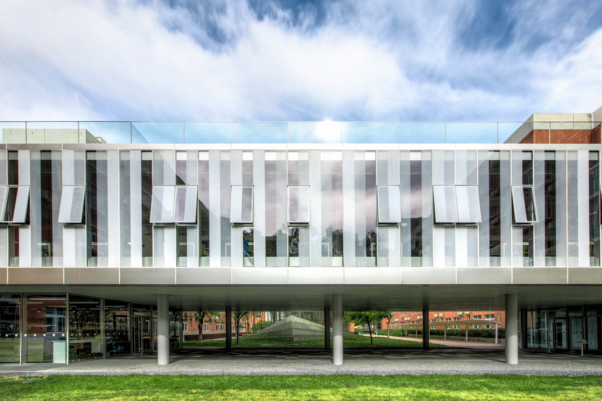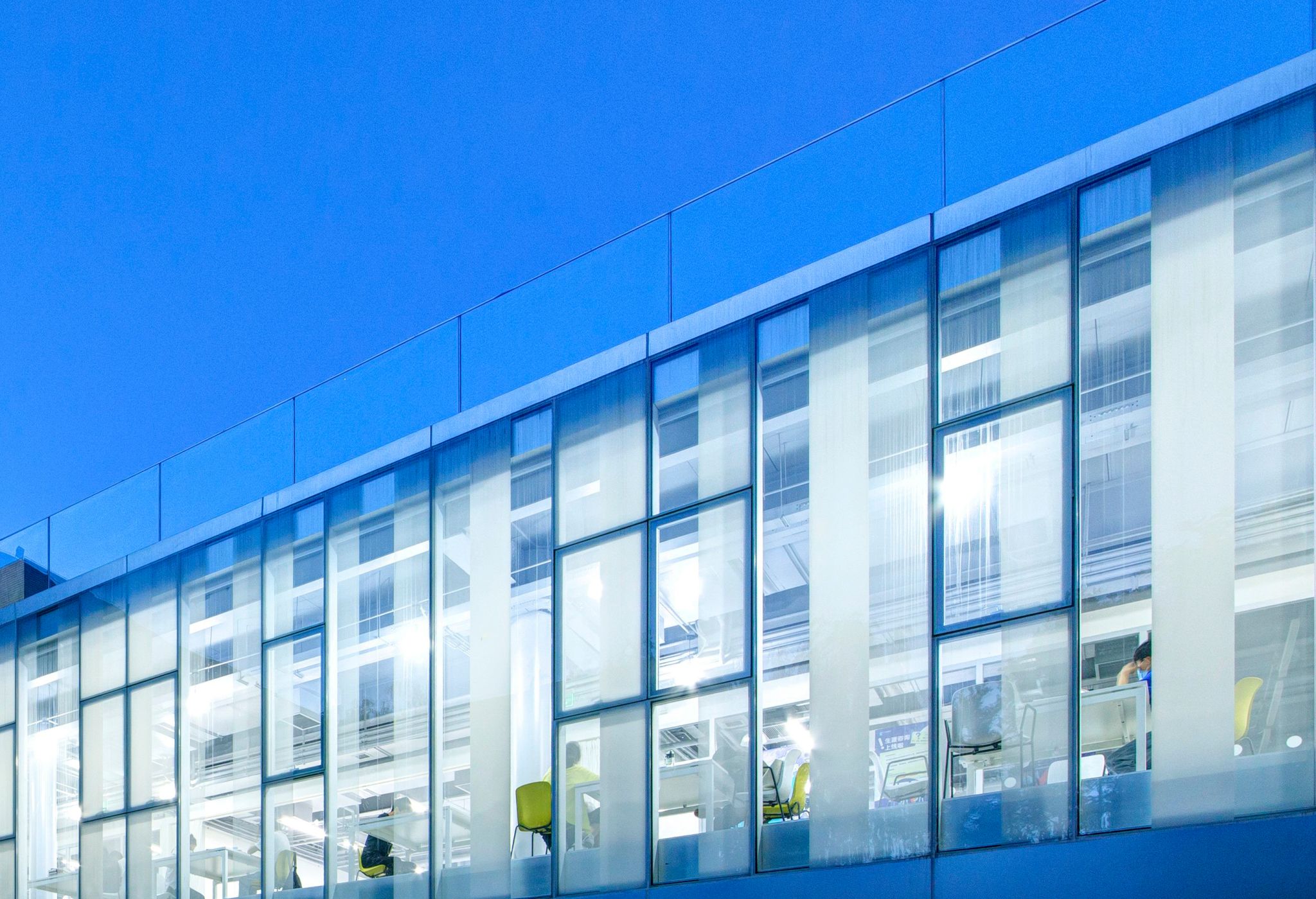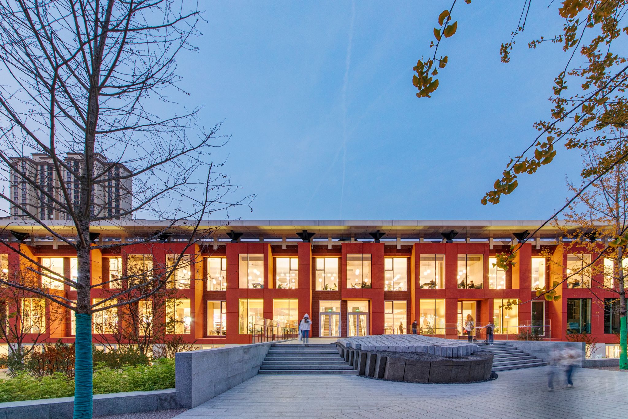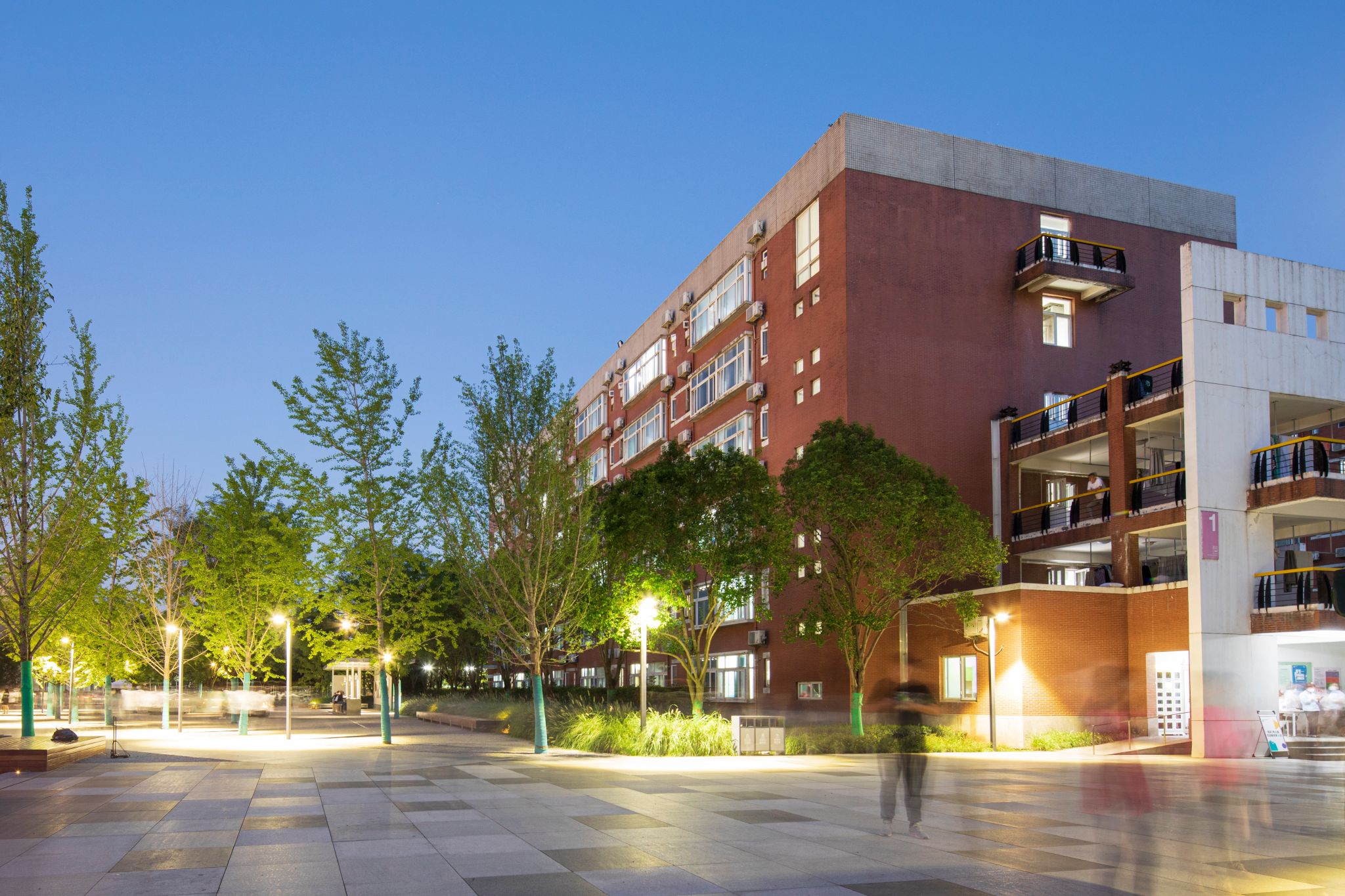 南区学生客厅,于2020年投入使用,在原有的公寓楼四合院里,将4栋楼用大面积的玻璃及钢结构材料连接起来,形成了一个70多米长的通廊,随光影变化而若隐若现。