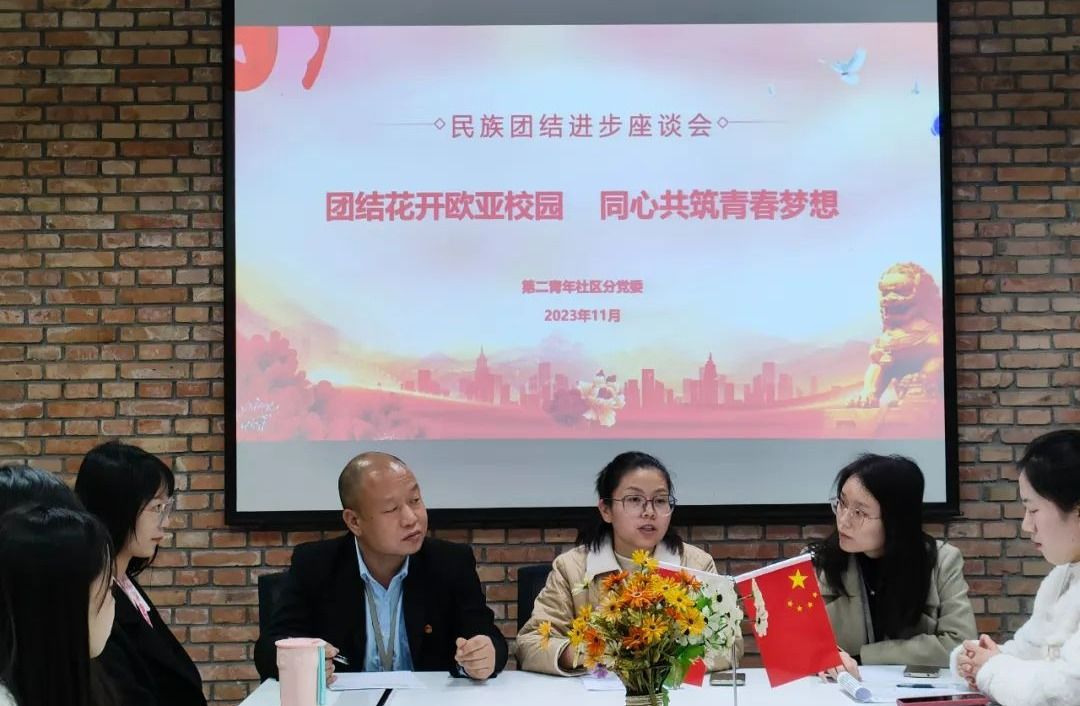 为深入学习宣传贯彻习近平总书记关于加强和改进民族工作的重要思想,引领我国民族团结事业不断创新发展,推进学校民族团结教育,增强学生的民族共同体意识。2023年11月17日,第二青年社区分党委在团辅室召开主题为“团结花开欧亚校园,同心共筑青春梦想”少数民族座谈会。出席本次座谈会有第二青年社区分党委书记、分党校校长白利宁同志,副书记张庚同志,各支部书记及少数民族学生代表20余人。会议第一项:由白利宁同志介绍关于民族团结的相关政策及工作部署。...